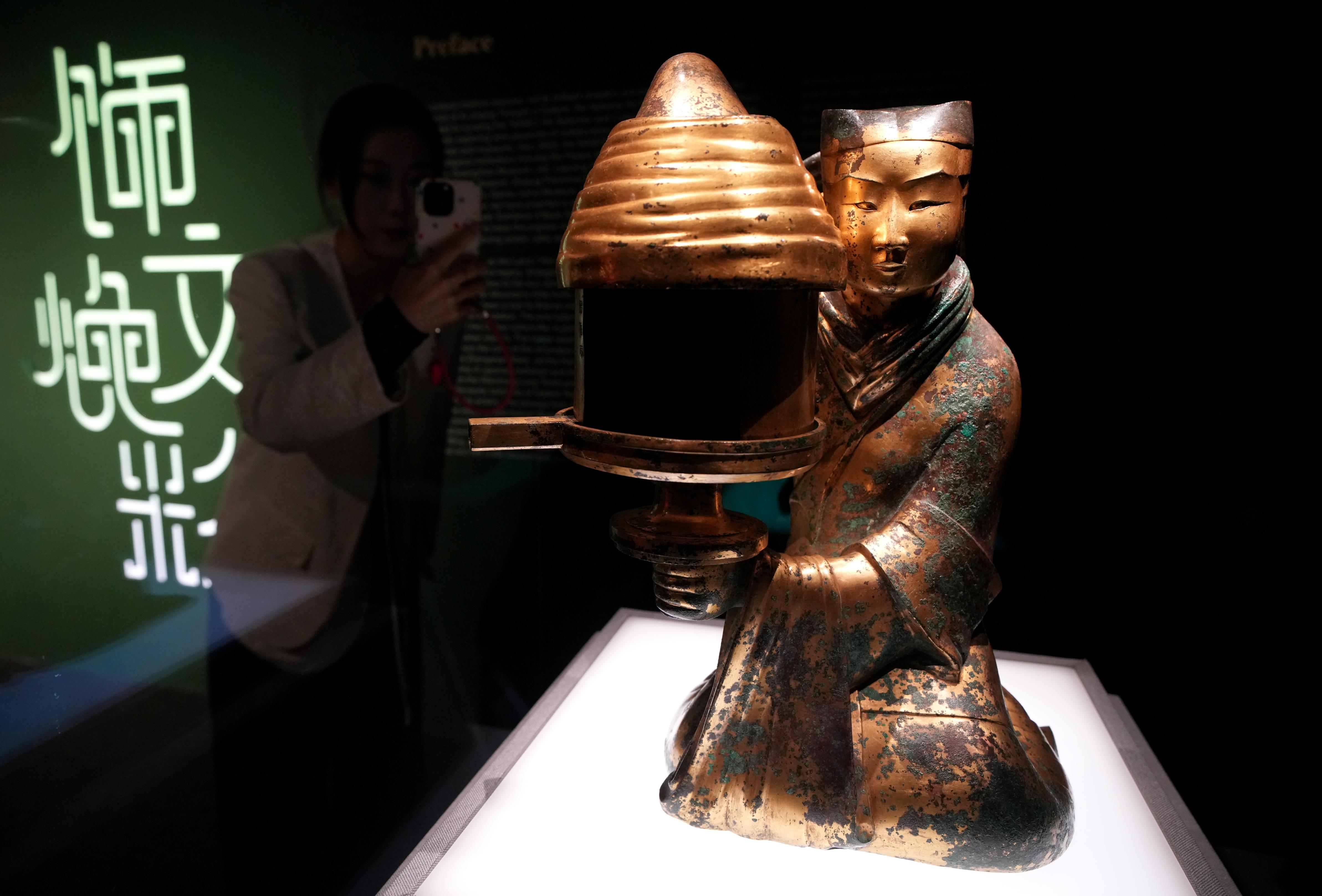长信宫灯亮相中国美术馆“饰文焕彩——河北古代艺术珍品展”。北京日报客户端记者 安旭东 摄