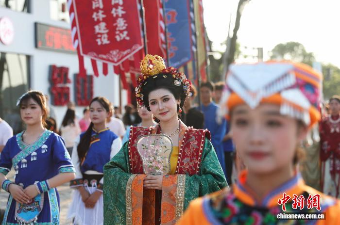 4月18日,第四届上饶“三月三”民族文化系列活动在江西省上饶市铅山县河口镇举行。活动现场设置了非遗集市、特色美食集市、民俗文化体验集市及科普展品体验等多个互动板块,推动民族文化与文旅发展、乡村振兴深度融合,促进各民族同胞交往、交流、交融。图为现场的巡游活动。中新社记者 刘占昆 摄