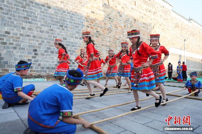 图为现场孩童跳起“三月三”竹竿舞。中新社记者 刘占昆 摄