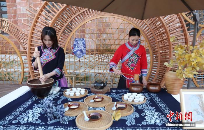 图为现场穿着民族服饰的工作人员正在制作畲茶。中新社记者 刘占昆 摄