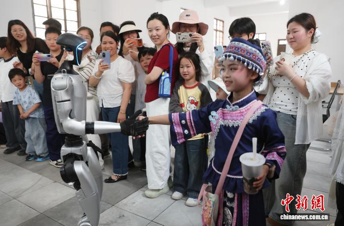 图为穿着民族服饰的小朋友正在和人形机器人握手互动。中新社记者 刘占昆 摄