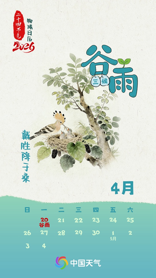 谷雨正值“雨润万物”的时节,春雨绵绵滋润大地,也是农耕的关键时期。此时柳絮飞落,雨打浮萍,杜鹃夜啼,牡丹吐蕊。古人将谷雨分为三候:一候,萍始生;二候,鸣鸠拂其羽;三候,戴胜降于桑。