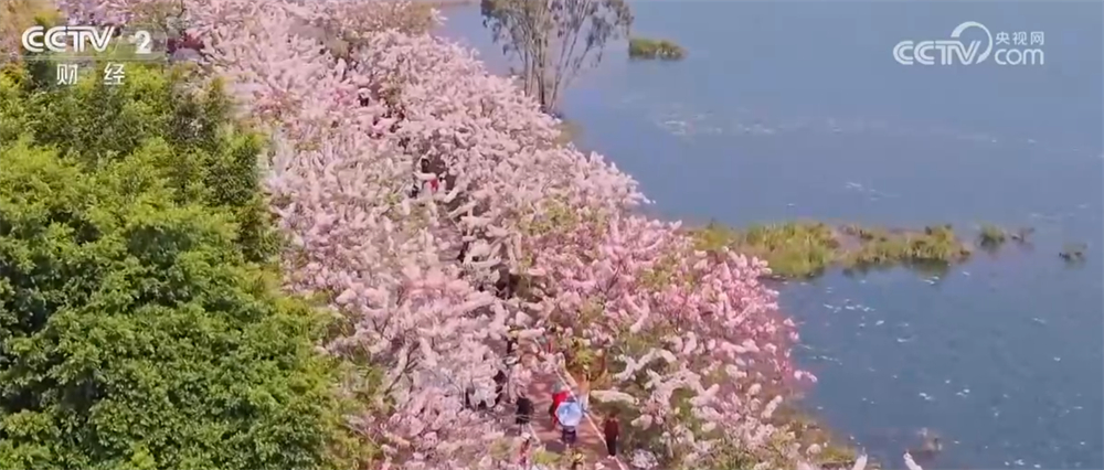 在石屏县异龙湖,万株神黄豆花铺开粉色花海,花海与碧波荡漾的湖水交相辉映。游客纷至沓来,尽享踏春美好时光。