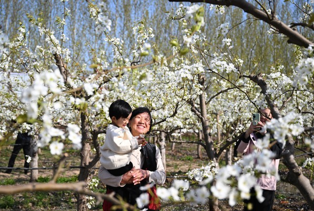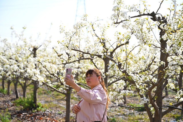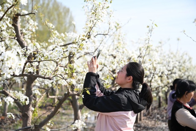 4月4日,游客在威县梨园赏花游玩。