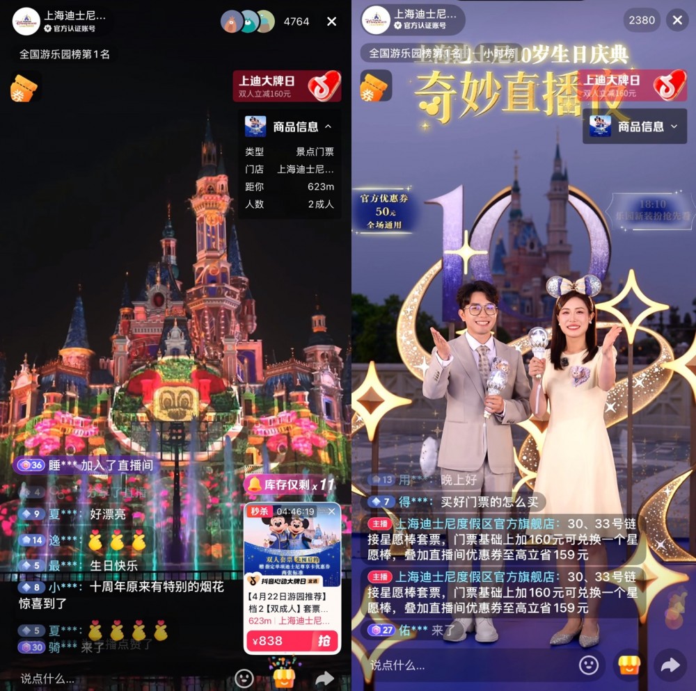 本次活动中,上海迪士尼度假区抖音官方旗舰店首次开启乐园实景直播,成为一大亮点。4月17日17:00,上海迪士尼度假区“奇妙直播夜”在抖音官方旗舰店开启实景直播,直播场景设于奇幻童话城堡前,全程实景呈现十周年庆典盛况。奇梦之光幻影秀十周年特别版、城堡庆典等专属内容同步直播,让无法到场的用户在线感受十周年庆典氛围。数据显示,该场直播曝光超1700万次,当天直播间团购销售额同比增长163%。