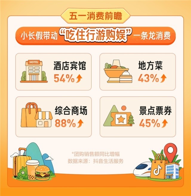 “五一”假期临近,全国吃住行、游购娱等多类消费需求旺盛。4月29日,抖音生活服务发布“五一”假期消费前瞻数据,4月11日至4月27日,平台上地方菜团购销售额同比增长43%,酒店宾馆增长54%,景点票券增长45%,综合商场增长88%。三线及以下小城游受热捧,柳州、赣州、开封、湖州等抖音吃喝游玩团购增长超6成;上海、福州、厦门、郑州、成都等热门旅游城市消费走热。乐园度假区、国风主题文化景区颇受抖音网友欢迎,平台预测,北京环球度假区、上海迪士尼度假区、郑州银基动物王国、开封万岁山武侠城等景区将迎客流高峰。