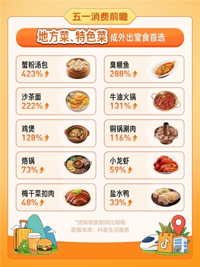 从北京铜锅涮肉到贵州烙锅,从蟹粉汤包到盐水鸭,从臭鳜鱼到沙茶面——平台上,具有地方特色的地方菜成为人们出行或聚会堂食选择上的“心头好”,整体抖音团购销售额同比增长43%。其中,蟹粉汤包增长高达423%,臭鳜鱼和沙茶面分别增长288%和222%。近期,广东佛山莫氏鸡煲因达人探店走红,受热点内容推动,节前抖音平台鸡煲团购整体销售额增长128%。同时,铜锅涮肉抖音销售额同比增长116%,牛油火锅和桑拿鸡增长1倍以上,烙锅、梅干菜扣肉和盐水鸭增幅也颇为可观。