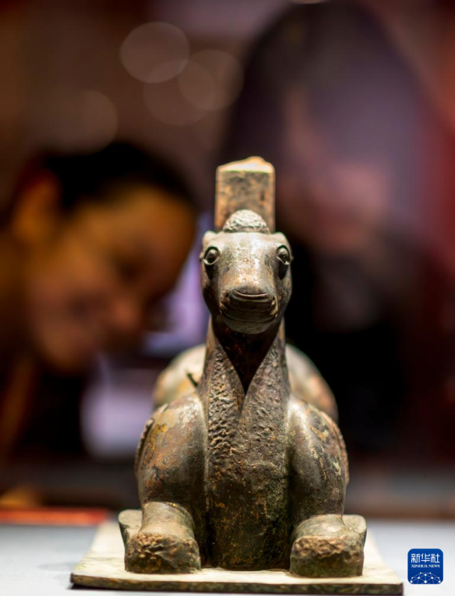 观众在欣赏神兽形青铜虡座(4月29日摄)。