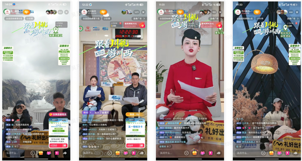 近日,四川航空(下称“川航”)联合抖音生活服务完成首次大型航文旅主题直播 ——“跟着川航游川西”。4月17日至20日,川航携手甘孜文旅、康定机场集团、海螺沟、墨石公园等本地文旅伙伴,以四天实地沉浸式直播,带大众近距离感受川西自然风光与人文风情。直播间累计曝光超450万次,累计看播人次超37万,累计销售额突破2100万。