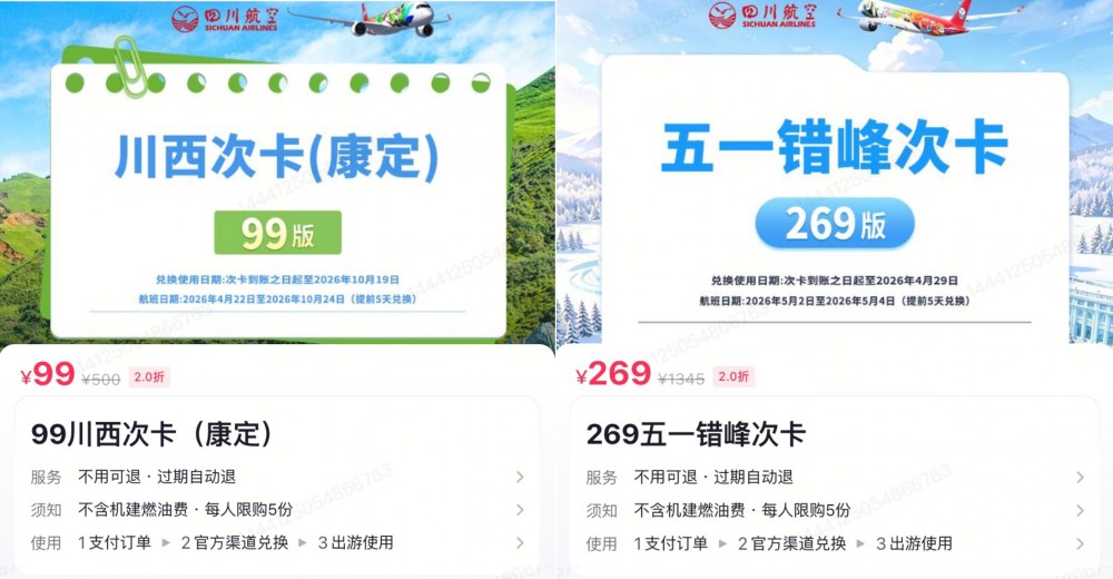 不同于传统品牌直播,此次活动把航线推广、目的地种草、好物售卖融为一体。依托自身航线资源,川航在抖音针对性推出川西定制次卡、五一错峰次卡等定制化航空产品,其中川西定制次卡价格低至99元;同时联合甘孜文旅上线317元、318元的终身门票次卡等特色文旅产品,打通机票、景区、本地消费的联动体验,为短途游、小长假出行人群提供灵活、高性价比的出行选择。