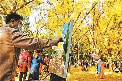 艺术家进园林,“落叶拼金秋”,在参观完地坛公园内标志性的点位后,艺术家们带着自己的作画工具,选取心仪的一角,用画笔勾勒心中最美地坛。园内,还有群众自发的乐队、舞蹈团等艺术团体及摄影爱好者,用自己独特的方式“记录”地坛秋景,让古老地坛充分沾染“文艺范儿”。