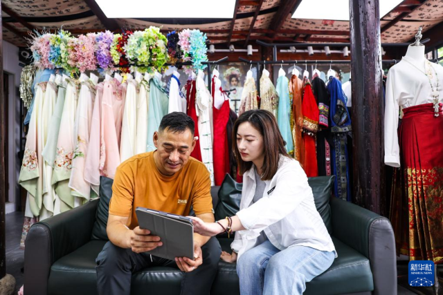6月18日,旅拍摄影师胡修刚(左)在慈城古县城景区为游客介绍拍摄场景。