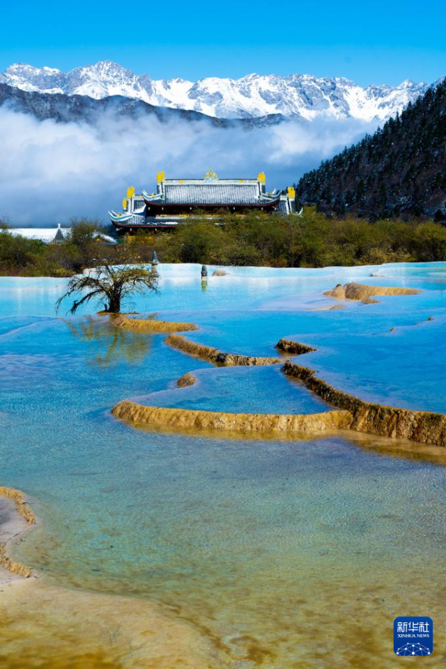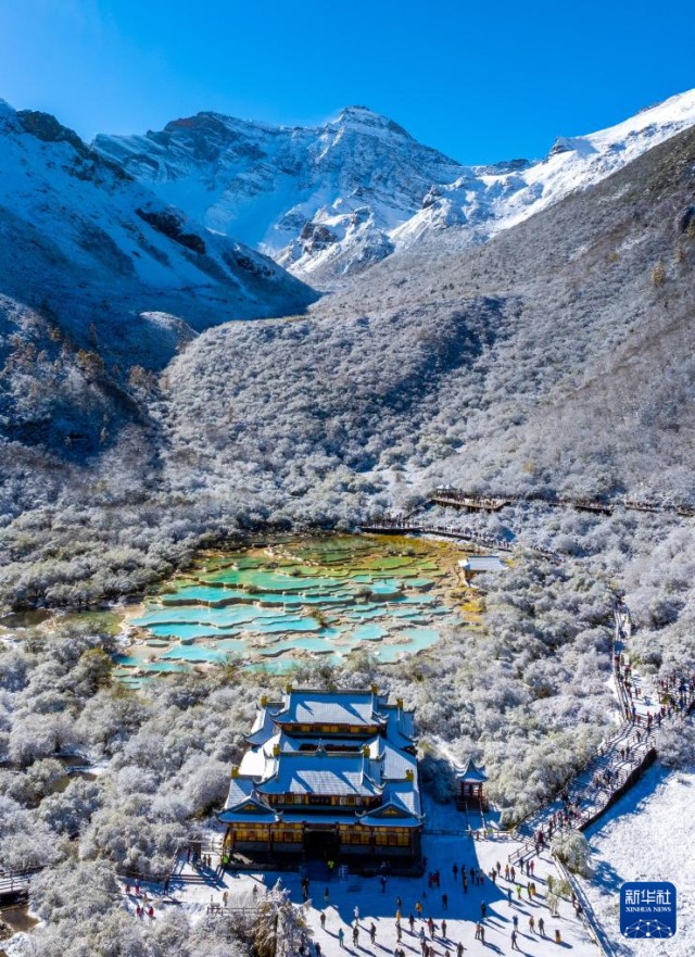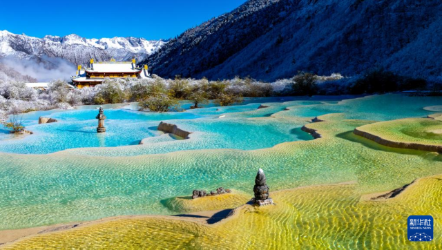 10月21日,四川省阿坝藏族羌族自治州黄龙景区迎来今秋第一场降雪,五彩池与皑皑白雪交相辉映,美不胜收。