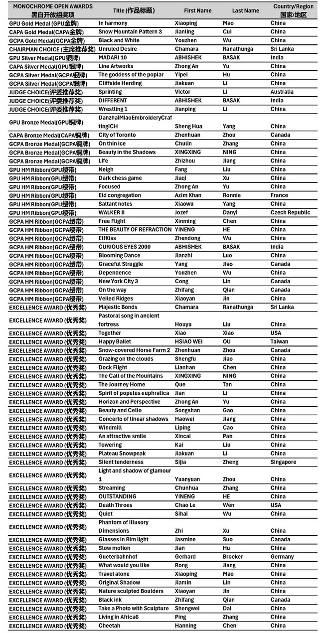 本届赛事共收到来自25个国家和地区摄影师投稿的近11,000幅作品,最终从彩色开放、黑白开放、自然、彩色风光(含无人机)、人主题与人物肖像、城市生活与街拍、AI新影像创意等七大类别中评选出457幅获奖作品。这些作品以多元的视角、真挚的情感与卓越的影像语言,呈现了摄影的广度与深度。所有获奖作品,将分期在本公众号陆续发布与分享,敬请关注。