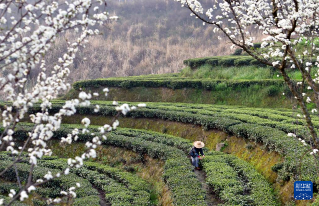 3月12日,在重庆市秀山土家族苗族自治县梅江镇兴隆坳现代农业园区茶叶示范基地,一名采茶工人在采摘春茶。