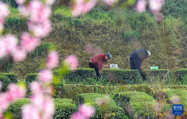 3月13日,茶农在三峡库区湖北省宜昌市秭归县茅坪镇金缸城村一茶园采摘春茶。