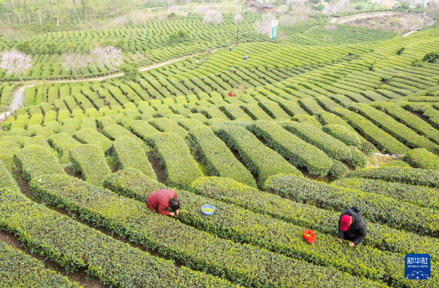 3月12日,茶农在贵州省开阳县南龙乡田坎村茶园采摘春茶(无人机照片)。